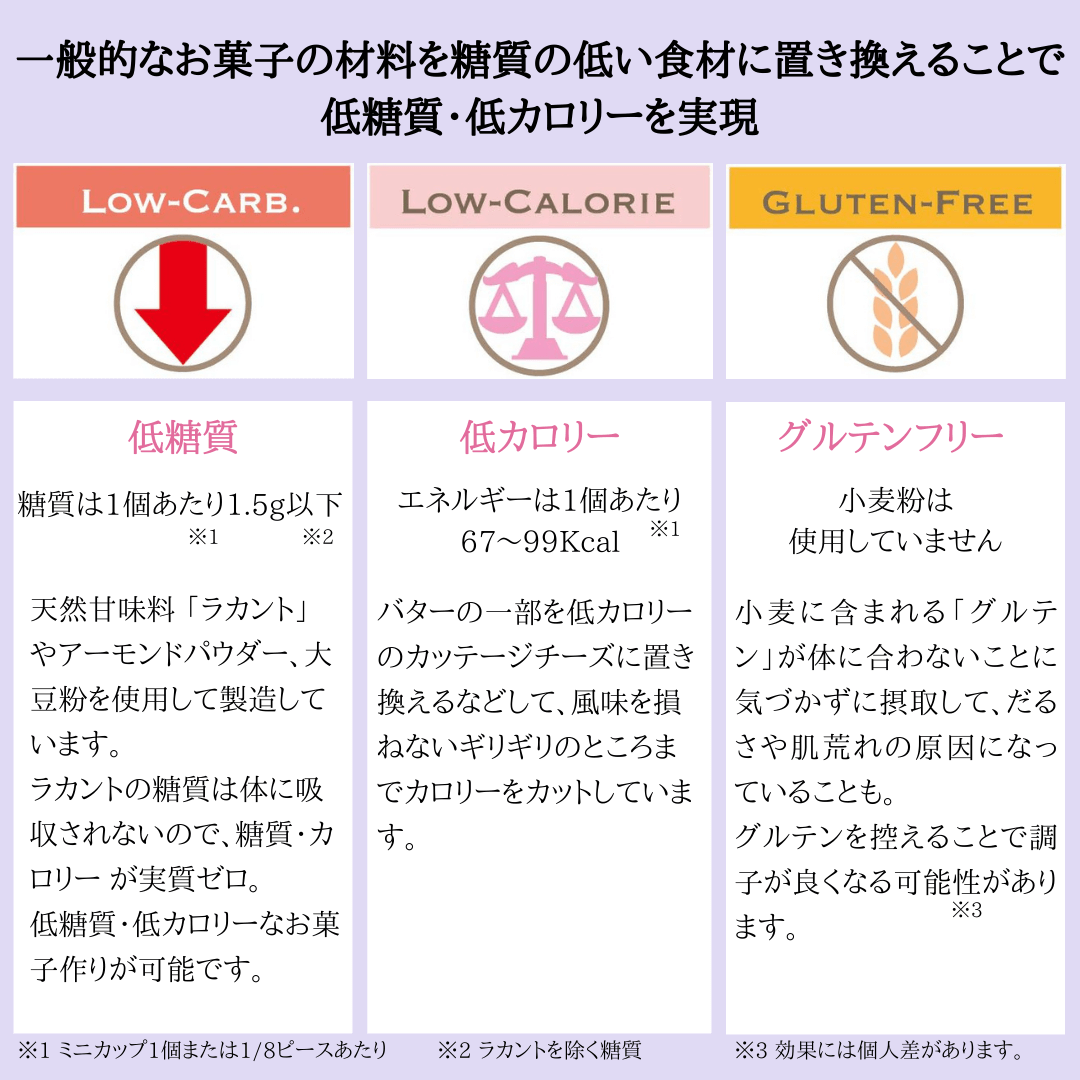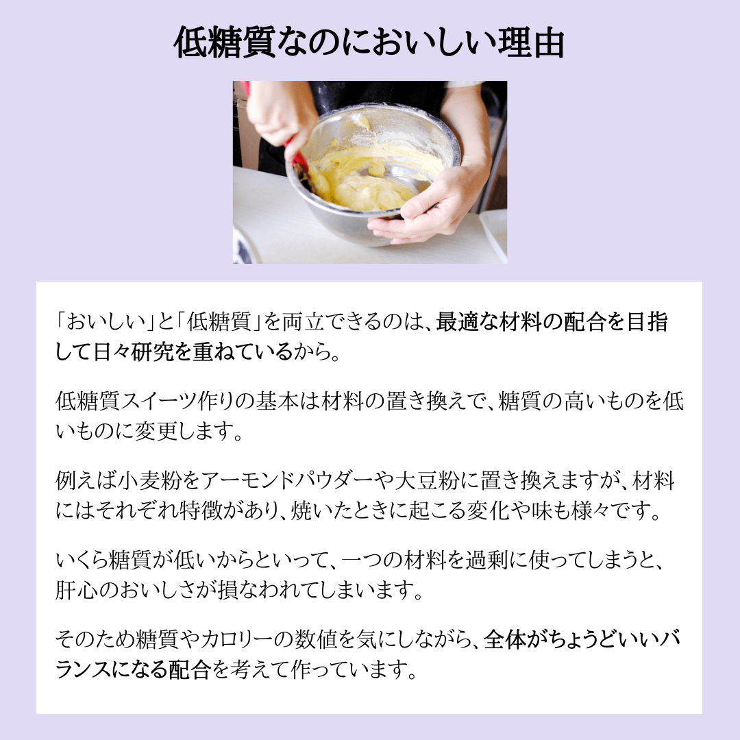 添加物や砂糖・着色料は不使用で、低糖質&グルテンフリーに仕上げました。