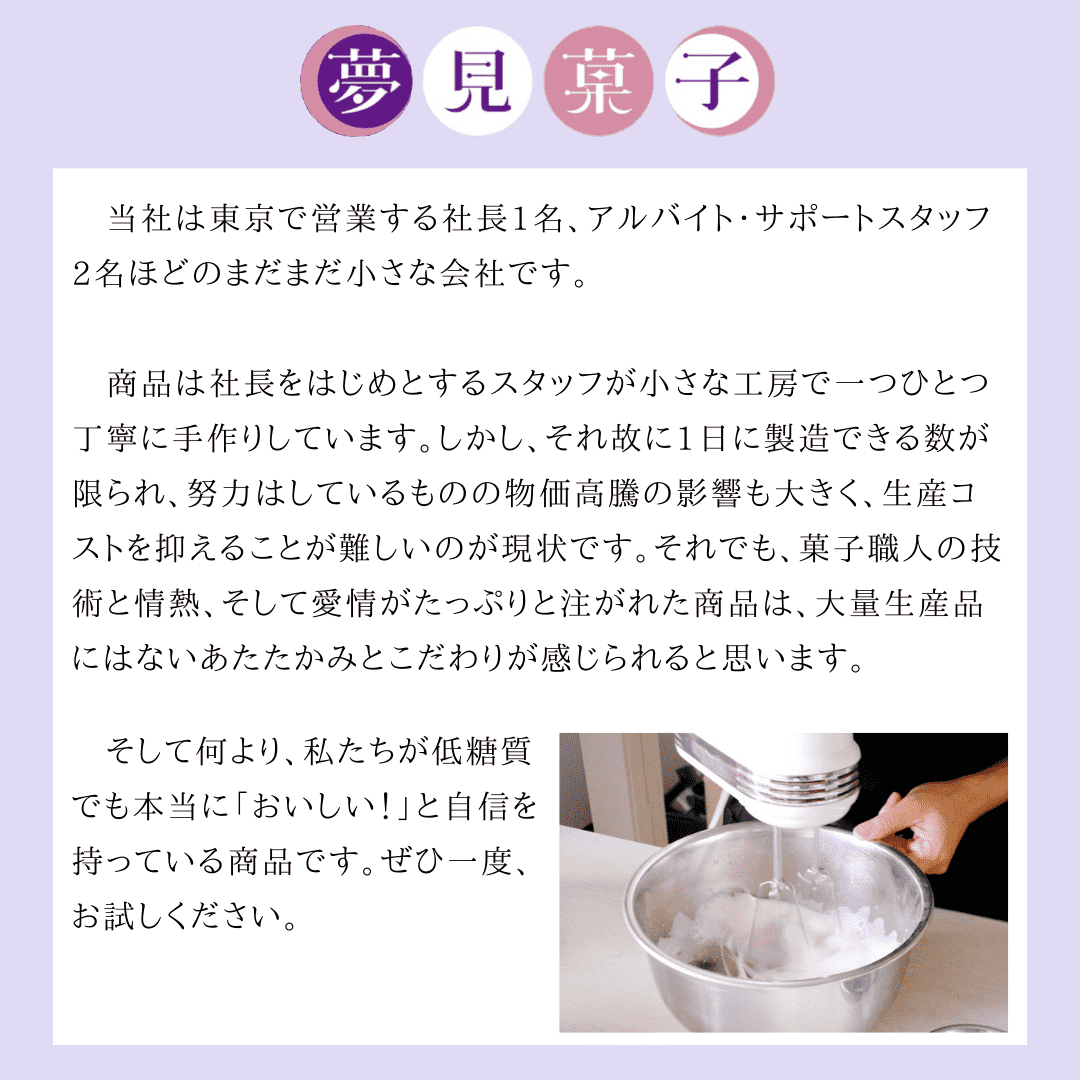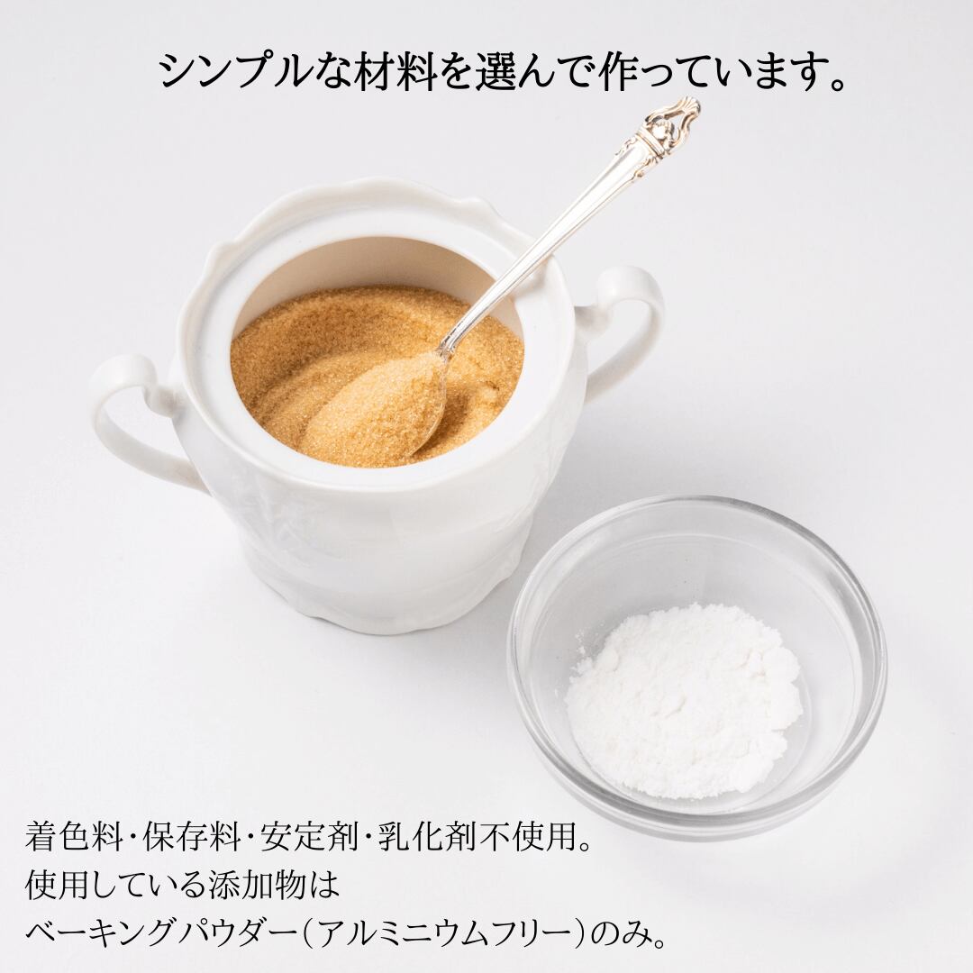 ・シンプルな材料を心がけ、着色料・保存料・安定剤・乳化剤不使用。